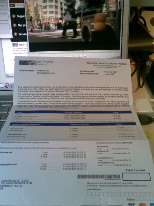 No, I do not feel particularly inclined to give up my lovely host at loopia to let a fucking snail mail spammer handle my domain! (Do not use Domain Registry of America (London, England). Just the name should be a giveaway … But I bet a lot of people get tricked to pay them anyway because of the deliberately tricky way the letter is written. I almost fell for it myself the first time.)